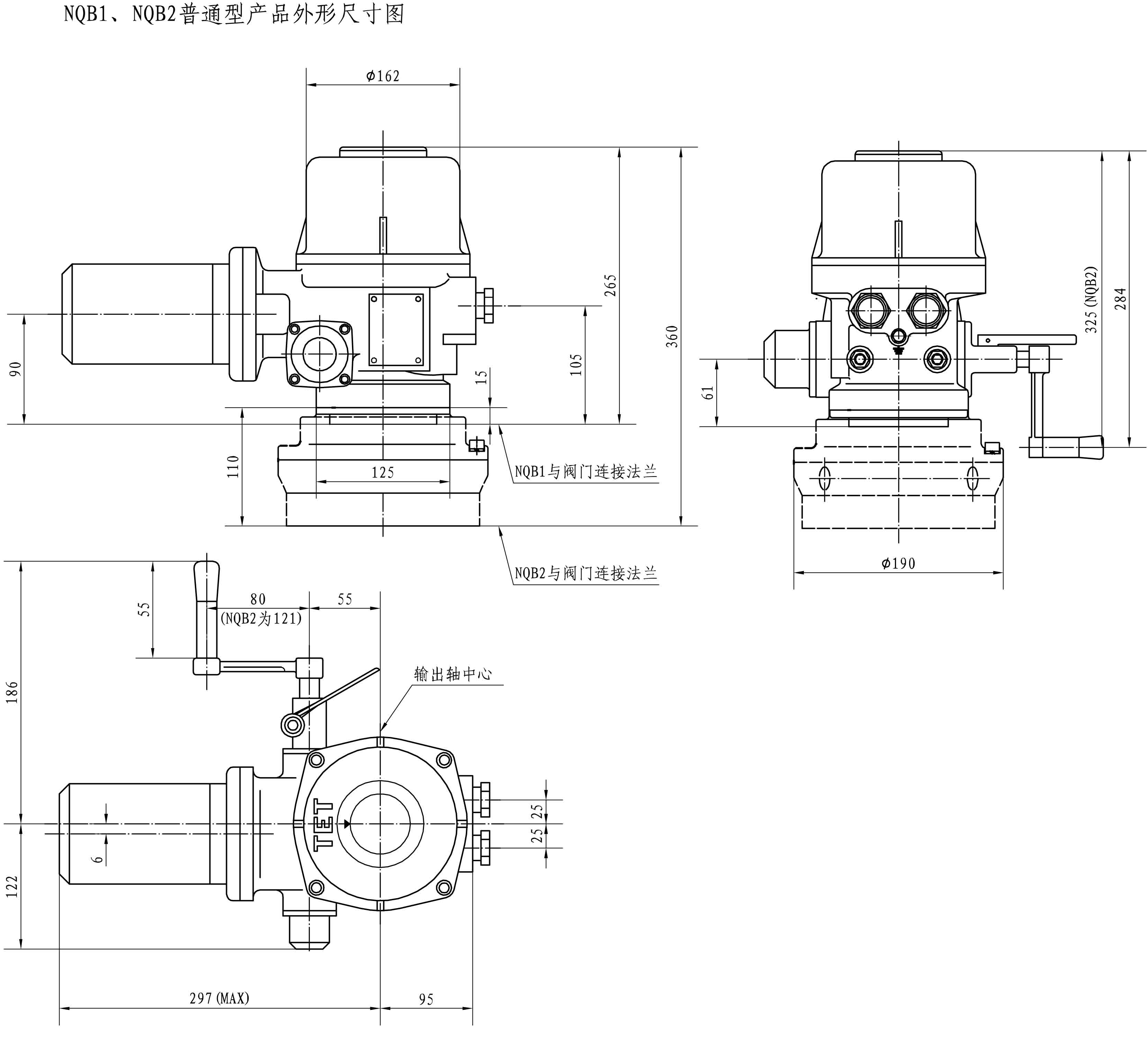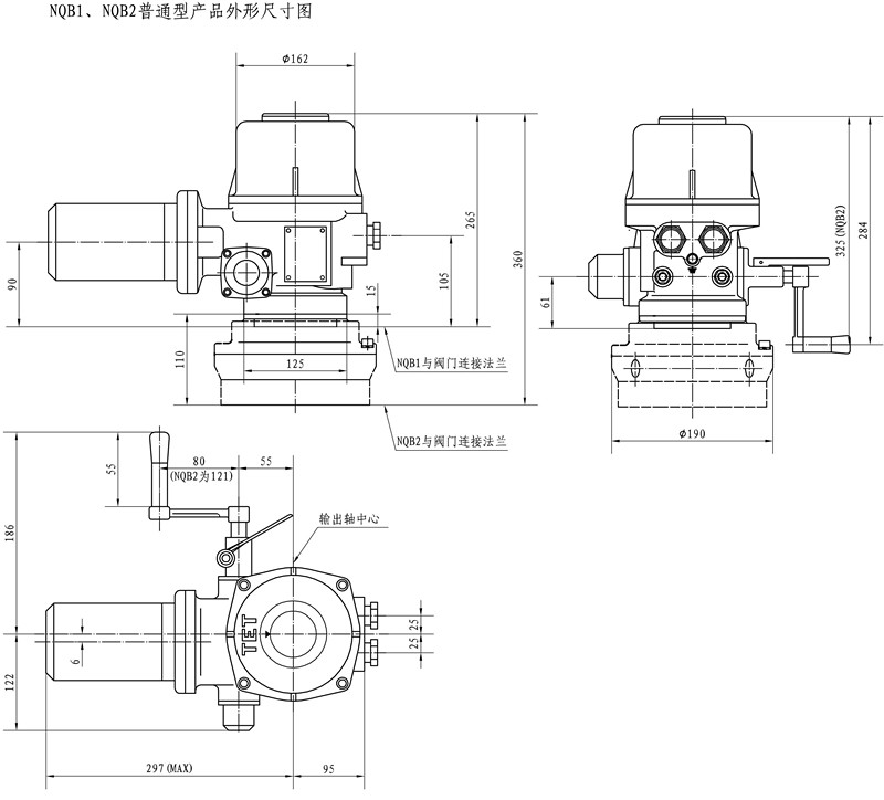 NQB1、 NQB2 電動裝置在繼承QB1、QB2 優點的同時又增設了產品的使用功能,并且改進了控制機構。通過改型設計的 NQB1、NQB2 電動裝置不僅提高了整體性能并且更實用、可靠。 NQB1、 NQB2 電動裝置的定位仍為經濟型,它適用于小口徑球閥、蝶閥、旋塞閥等閥瓣工作中90°回轉閥門和類似機構的控制。該產品與閥門組合后可廣泛地應用于石油、化工、電力、市政、冶金、食品、輕工等工業領域的管道控制系統。